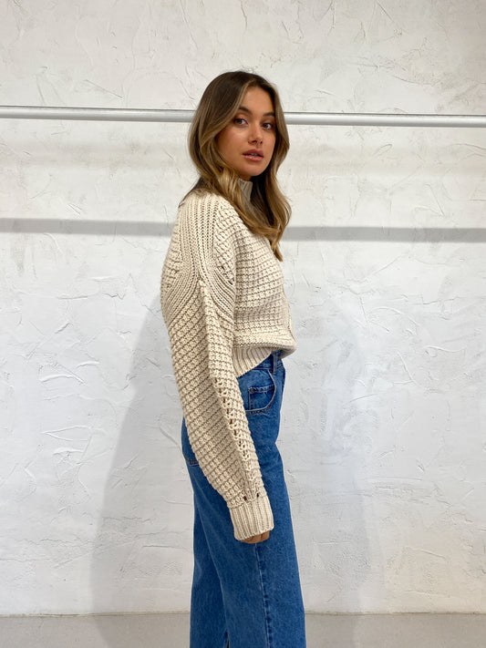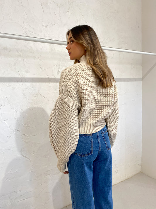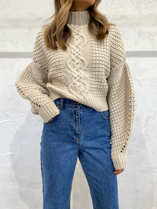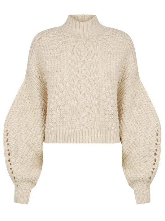 Featuring a high neckline, cable knit detail, drop shoulder that falls into a balloon sleeve and tapered ribbing detail at the neckline, hem and cuffs.