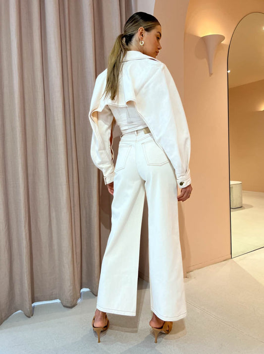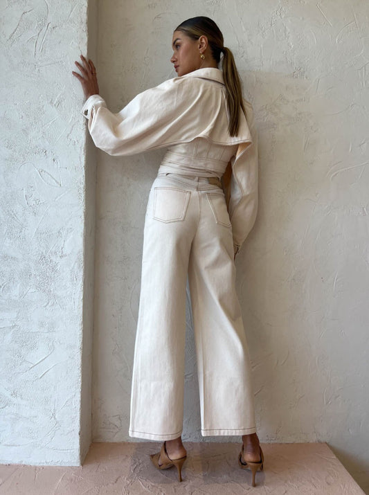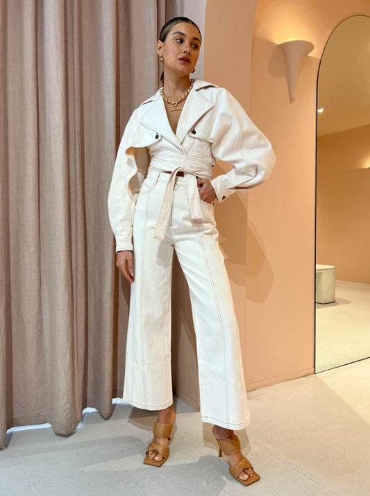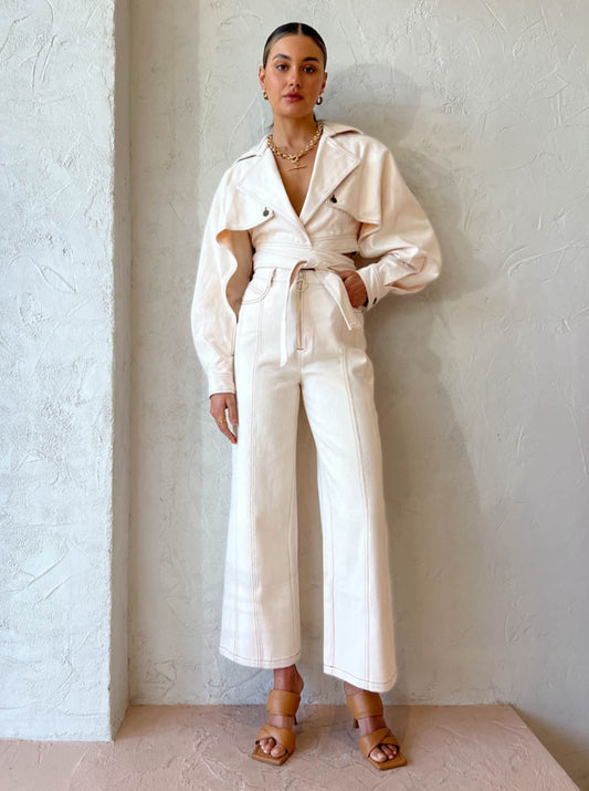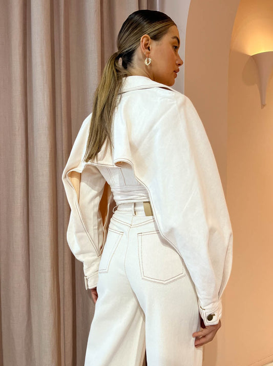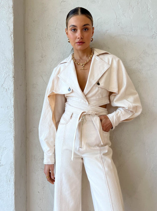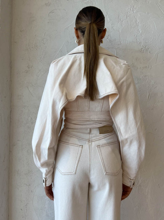Crafted from a signature denim fabrication, this cropped jacket sits oversized on the body. Featuring long sleeves with an accentuated ruffle overlay, collared neckline and a front closure with a waist tie to style as you wish.
