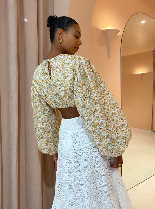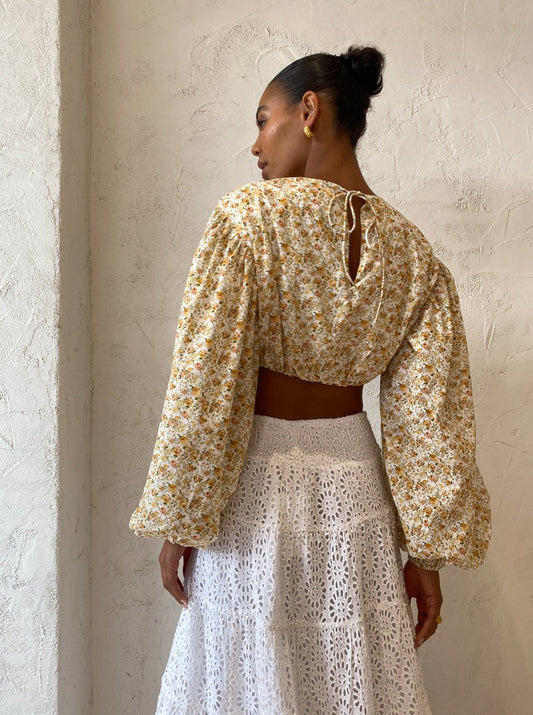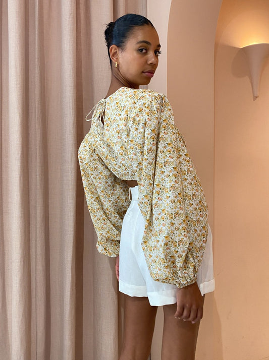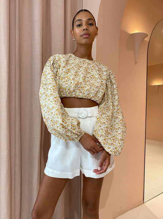 Crafted from a Cotton fabrication, this crop features a high neckline, dramatic blouson sleeves and an elasticated waist to form and accentuate.