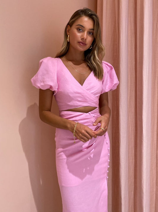 Designed in a bright pink linen blend fabrication, cropped silhouette with a v-neckline and short puffed sleeves.