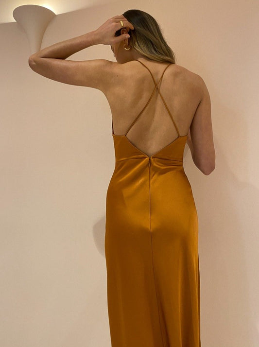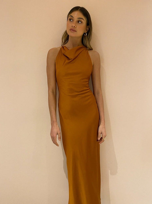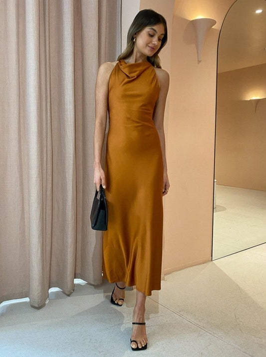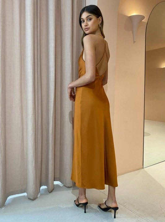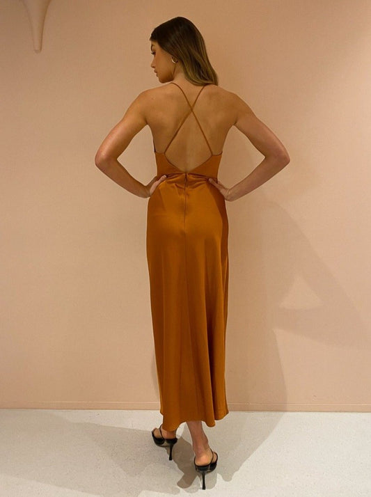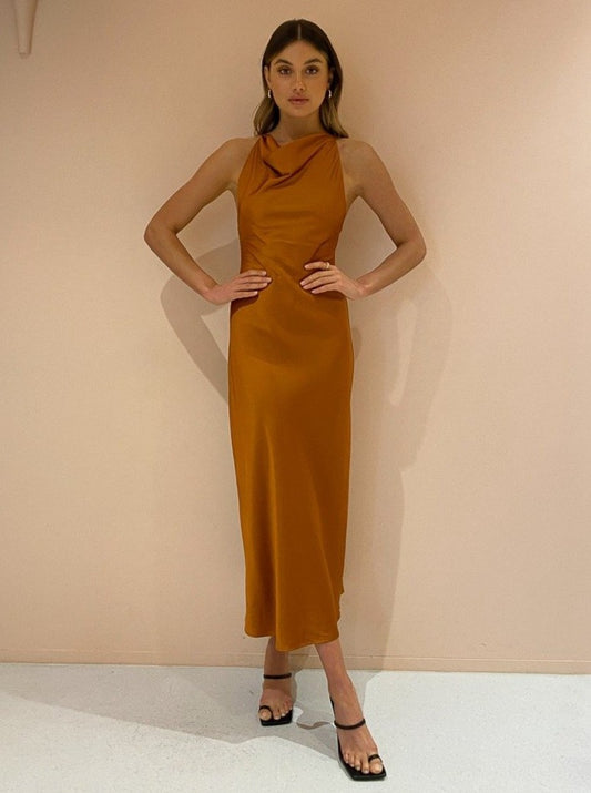 Designed to softly grace the femme form in a midi length, the Deidra Dress is crafted from a silky to touch polyester blend in a rich caramel hue.