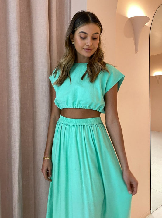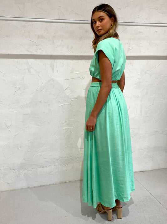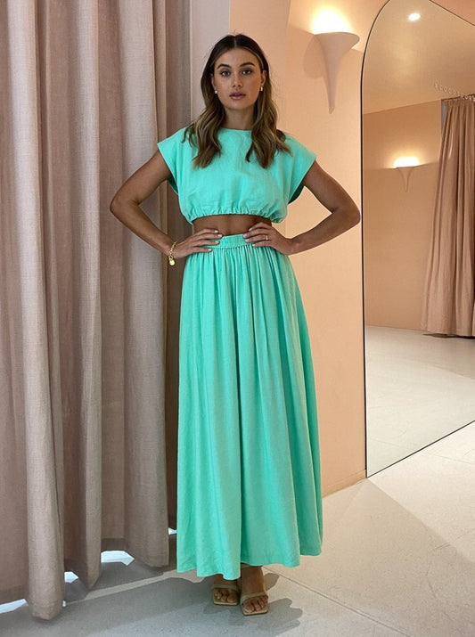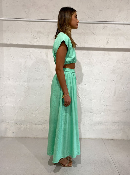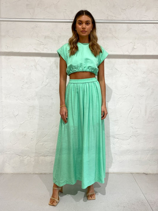 Cut from a linen blend and designed to fit through the waist with a comfortable elasticised waistband, the Emilie Skirt is a versatile maxi silhouette that falls relaxed for the ankle.