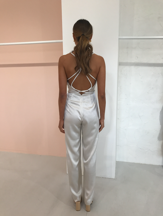 The Significant Other Lucine pantsuit is a wide leg fit with exaggerated v-neckline and statement crossover detail at back.