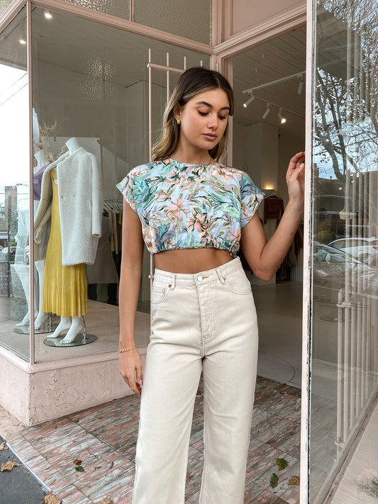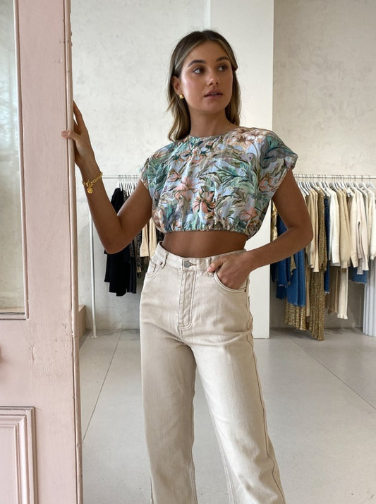 Designed with the Coco girl in mind, this classic crop silhouette is light weight and a relaxed fit cut from a linen blend with a round neckline, elasticised waistband and back button closure.