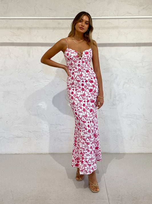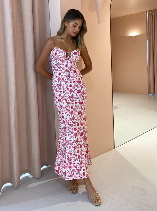 This midi features beautiful delicate lace up detail through the front and is crafted from a soft peony printed eyelet fabric.