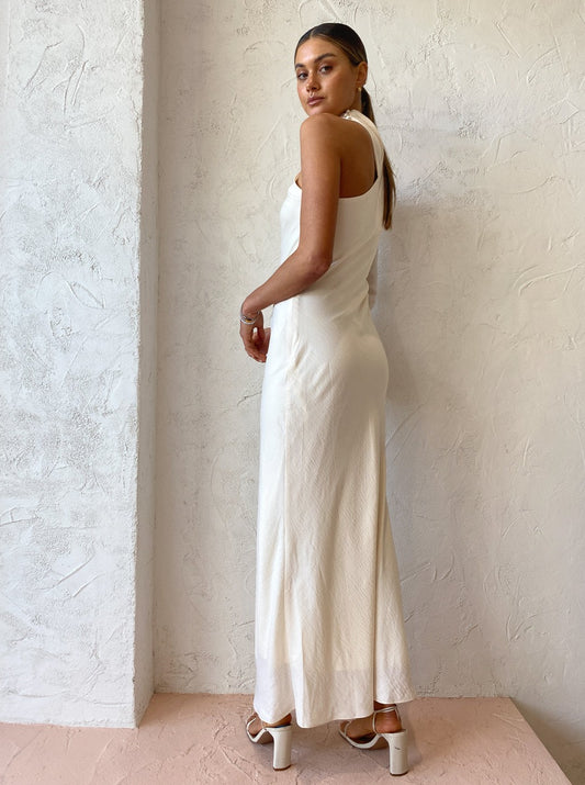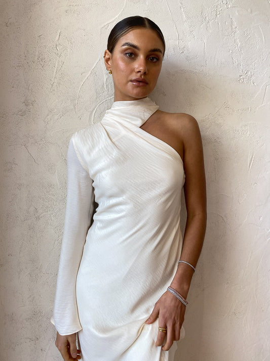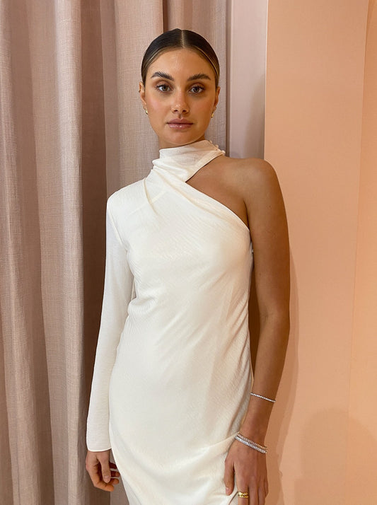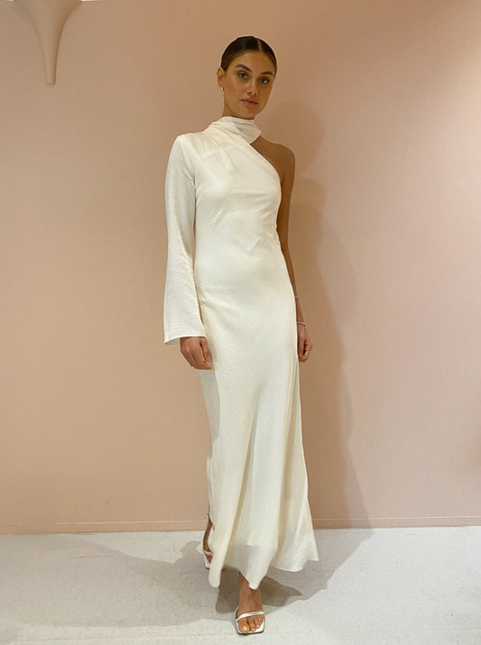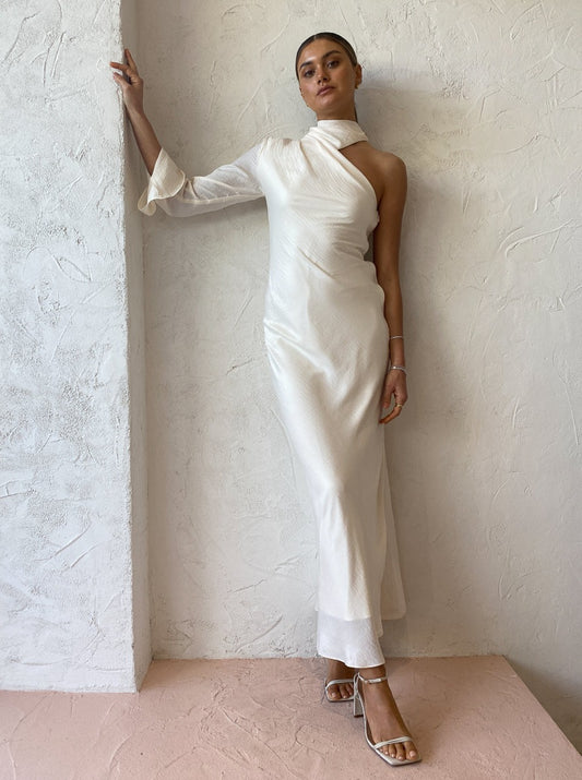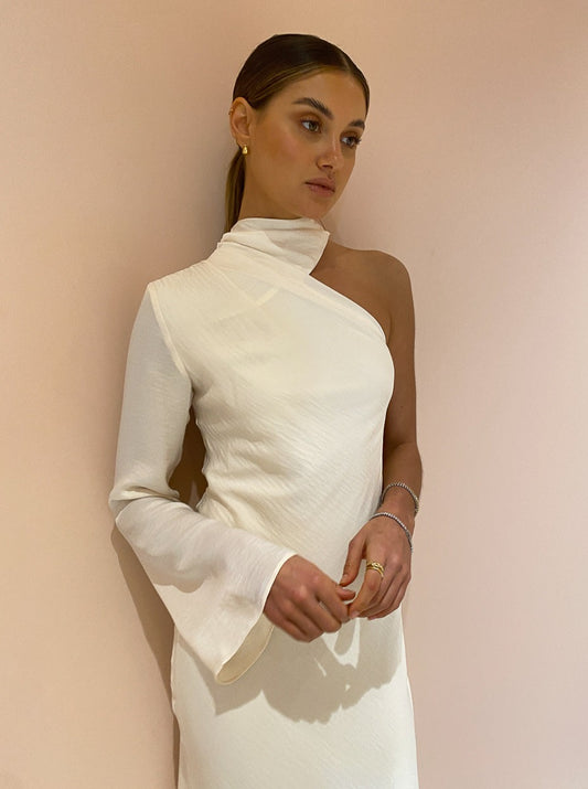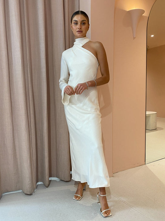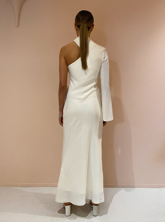 Thoughtfully crafted from a cream fabrication with a lustrous feel, this dress skims and flatters with its maxi silhouette. Featuring a high neckline, accentuated bell sleeve that extends into an asymmetrical cut out to create a one shoulder design.