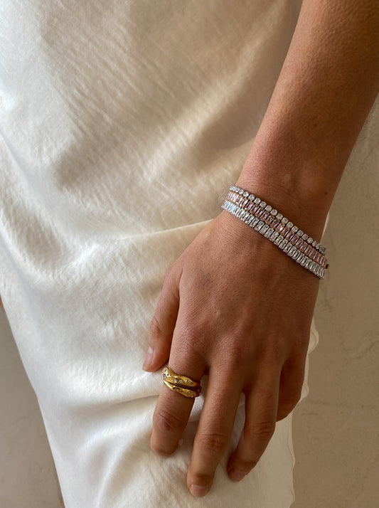 For simple yet sophisticated styling complete with the Alias Mae Camelia Heel in Bone. Add a touch of sparkle with Porter's Celestial Bracelet in Soft Pink, Porter Celestial Bracelet in SterlingPorter Baby Celestial Bracelet in Sterling and Porter Mali Ring Set in Gold.