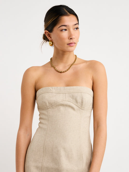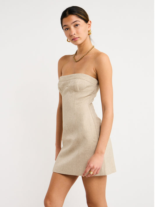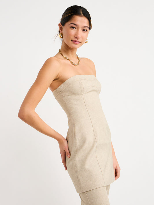 Crafted from a linen blend, this mini dress features a strapless neckline, fitted bodice and invisible side zip.