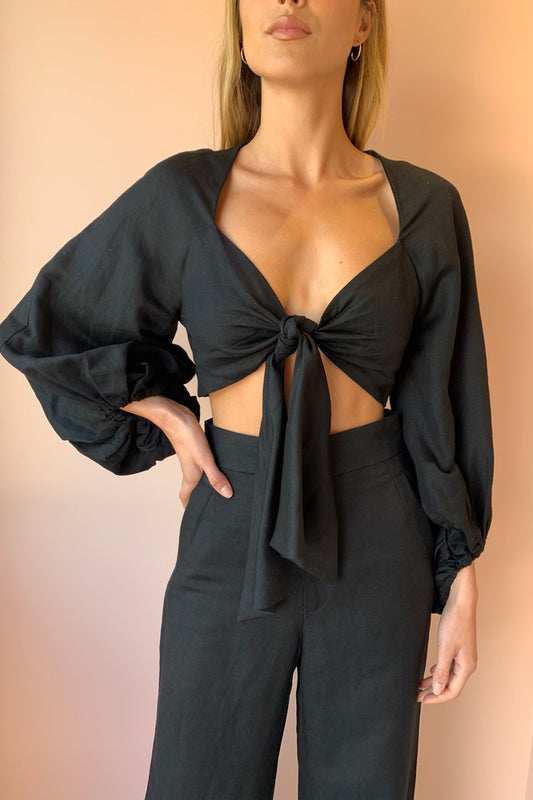 This cropped style with tie up centre detail is a fresh and fun silhouette perfect for hot summer days and balmy summer nights.