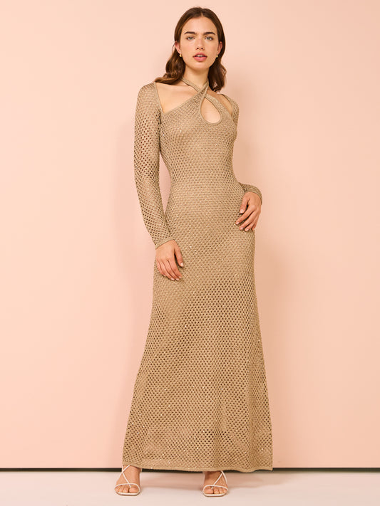 Crafted from a statement sequinned knit fabrication, this maxi dress features full length sleeves, halter neckline and cut out detail across the bodice.
