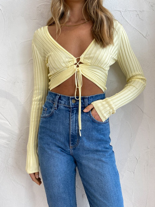 Crafted from a signature stretchy ribbed knit, this form fitting cropped length top features full length sleeves and a plunging V-neckline finishing with a lace up front.