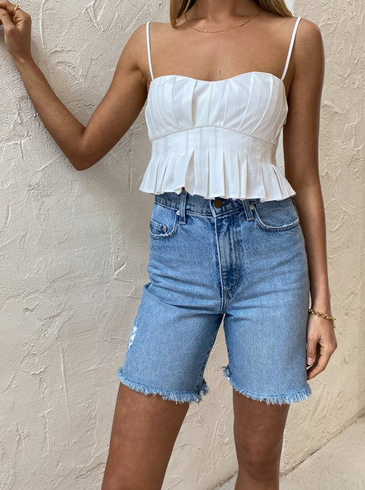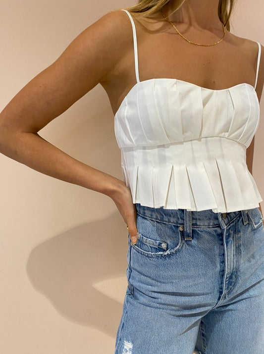 Crafted from a crisp Italian Cotton in a timeless neutral Chalk hue, the Anja Tucked Top is a charming fitted silhouette, with a flattering sweetheart neckline and complimentary slim adjustable straps that accent the femme décolletage.