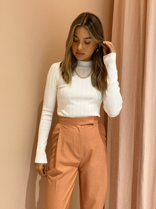 Crafted from a compact ribbed knit, the high neckline features a contrasting rib detail creating a sleek and tailored aesthetic.