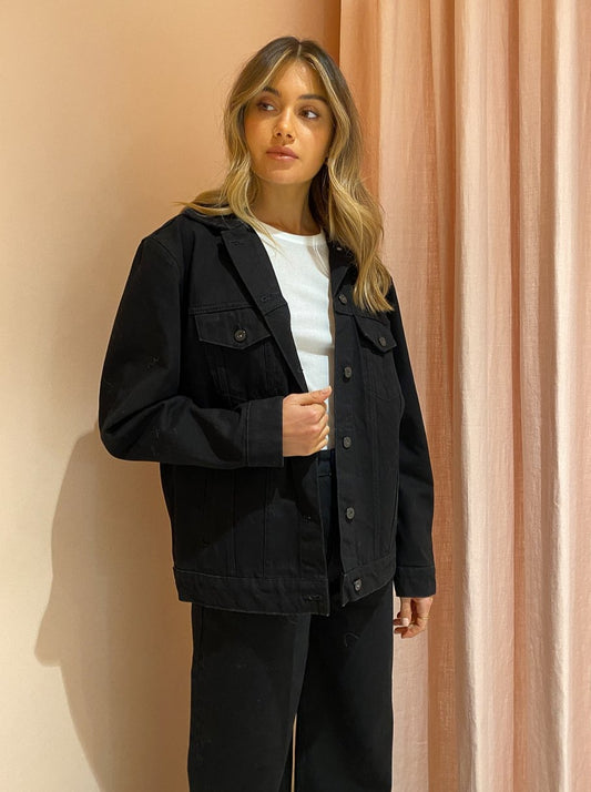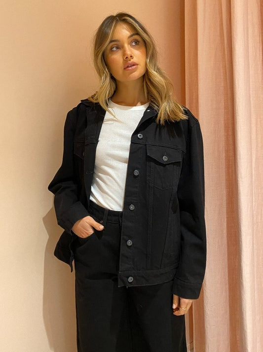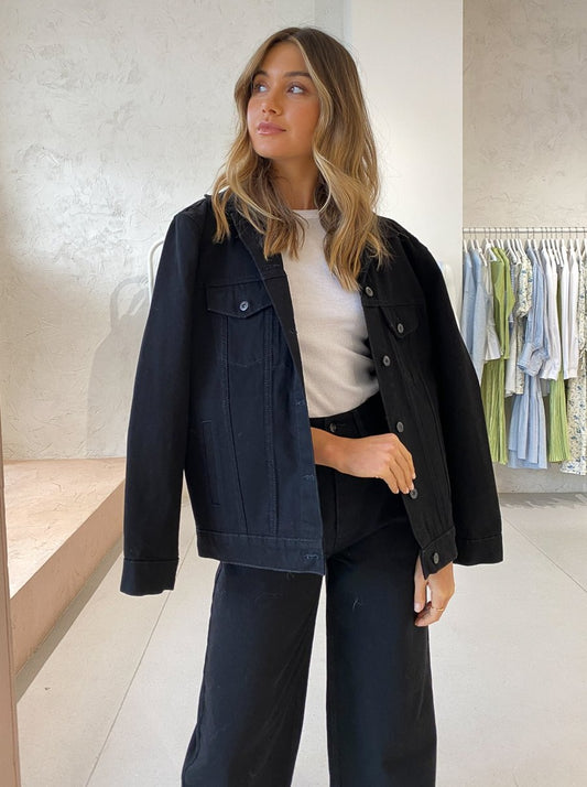 The SIR. Denim Jacket in Black Denim will add a contemporary edge to your wear on repeat Coco closet.