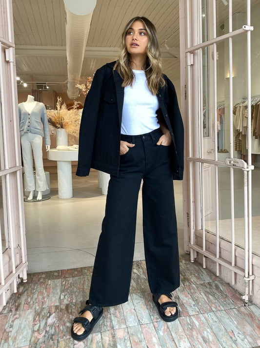 Coco Styling Tip: For your next winter dinner date, style this denim jacket with the SIR. Wide Leg Jean in Black Denim and the Elka Collective Kindred Tee in White