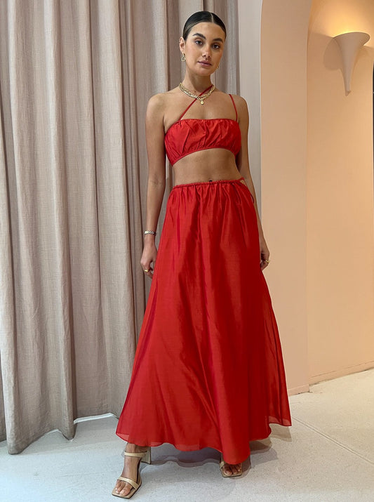 Complete the look with the Sir Lucelia Skirt in Red, the Alias Mae Cassie Heel in Natural, the Amber Sceats Walter Earrings in Gold, the Amber Sceats Coco Necklace in Gold and layer with the Amber Sceats Schiffer Necklace in Gold for your next special occasion.