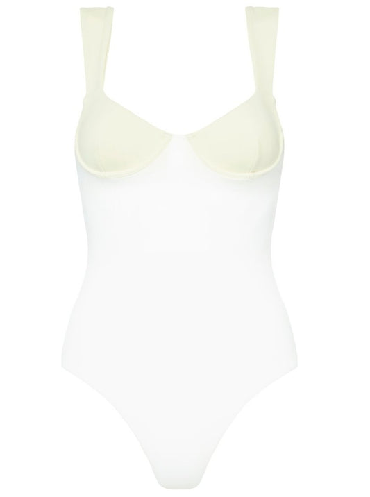 Crafted from a form flattering lycra fabrication, this one piece swimsuit references vintage design featuring a contrast two tone colour, wide fixed straps and an underwire bikini top.