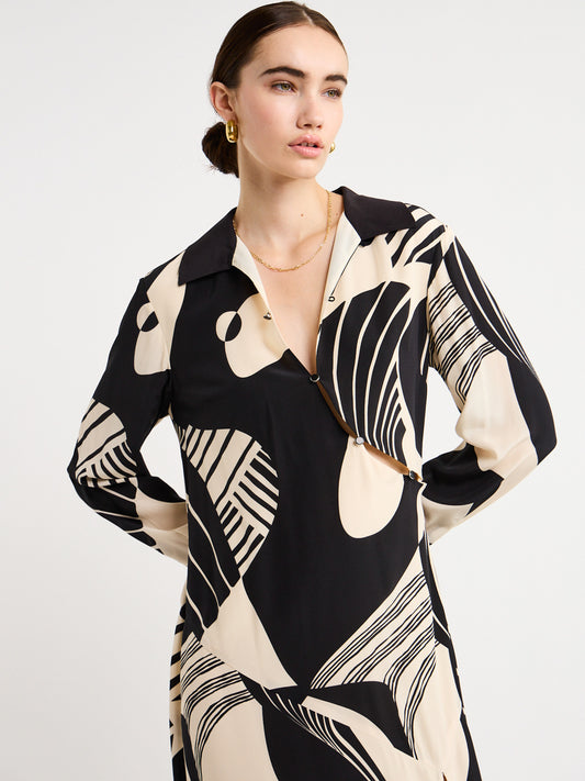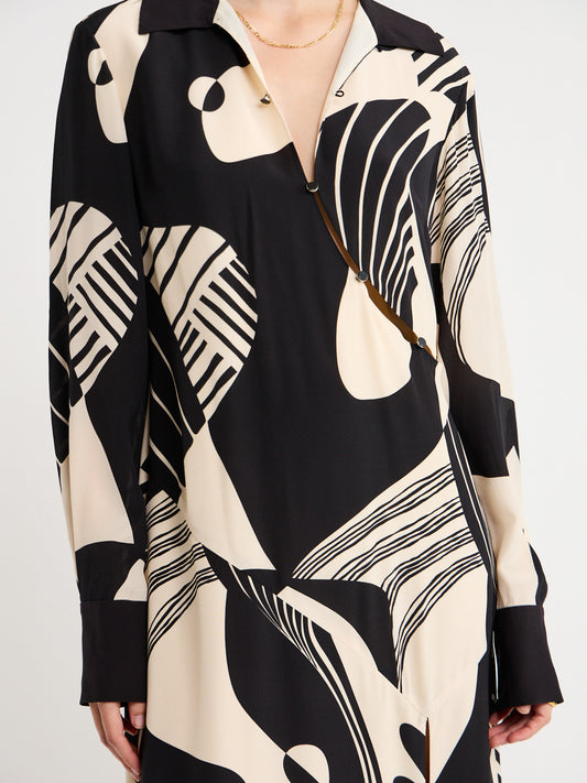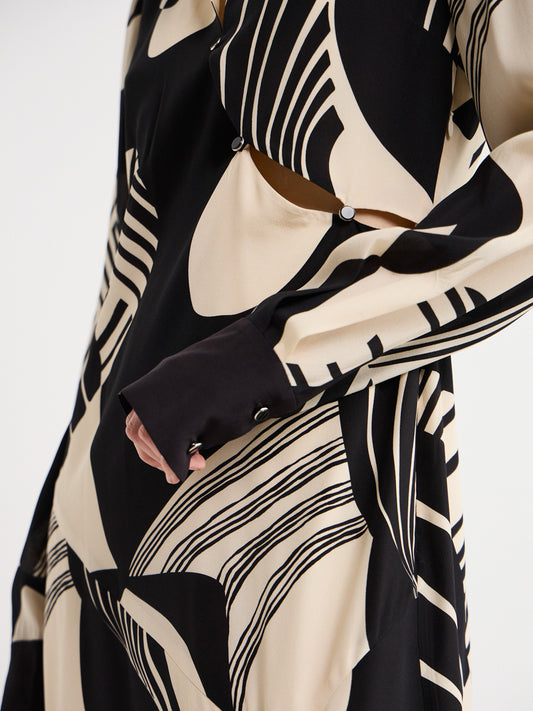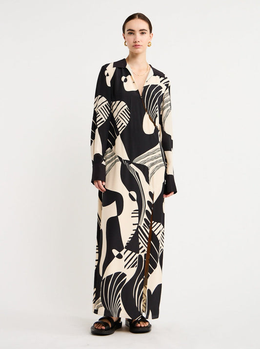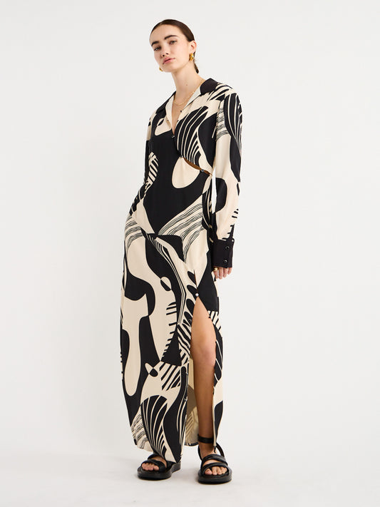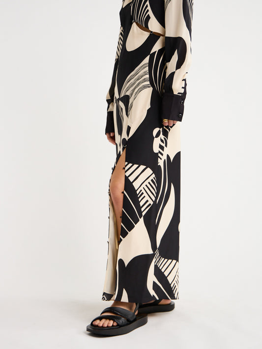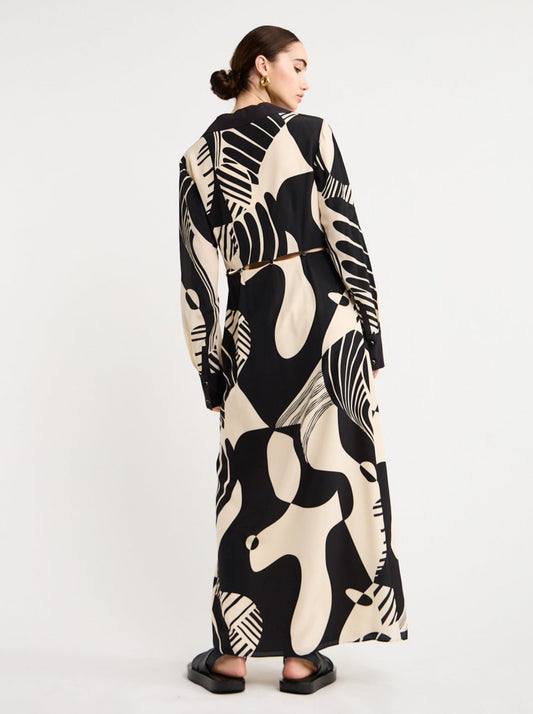 Crafted in a luxurious silk with a subtle sheen, it features an elegant collar, asymmetric buttons, a maxi length skirt, and an abstract monochrome print exclusively from SIR.