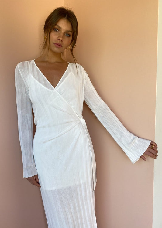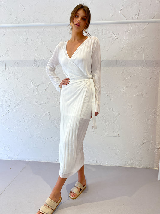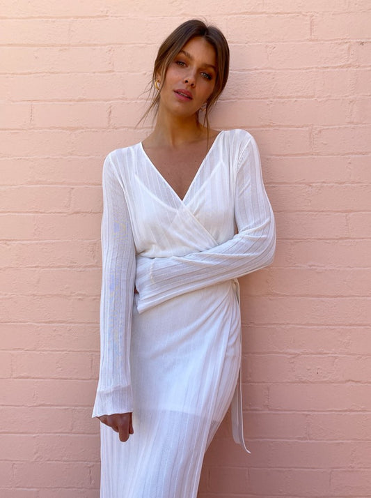 The SIR Vera Wrap Midi Dress in Ivory will be your favourite transeasonal dress in your wardrobe. Wear the included slip underneath or pair with your black bralette and boyshorts for more of a statement.