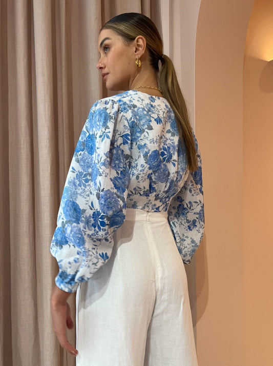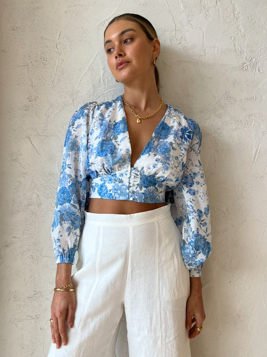 Crafted from delicate Ramie in a Blue Floral. This sunshine crop features long blouson sleeves with elasticated cuffs and a flattering V neckline.