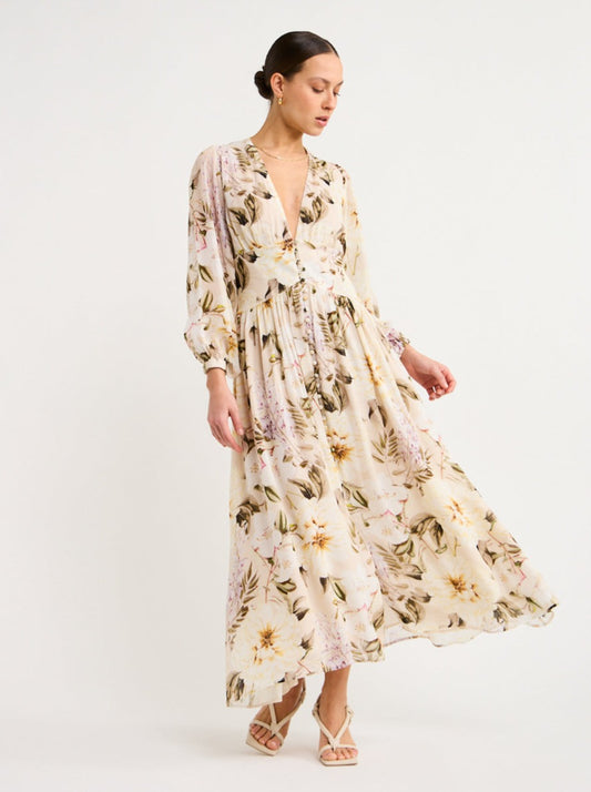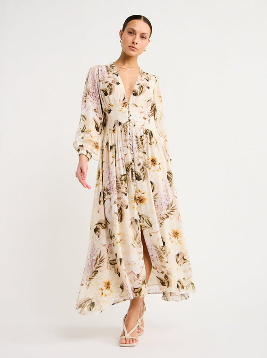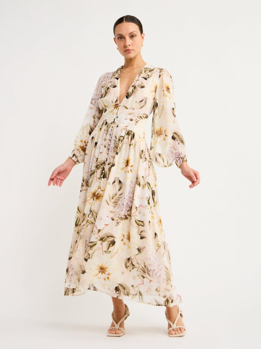 Crafted with feminine details such as the elegant V neckline, sculpted waistband and blouson sleeves, this enchanting maxi is accented with delicate self-covered buttons.