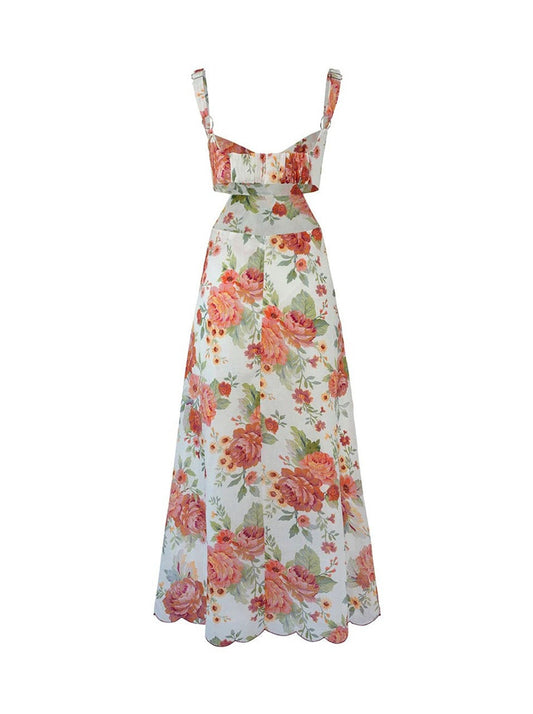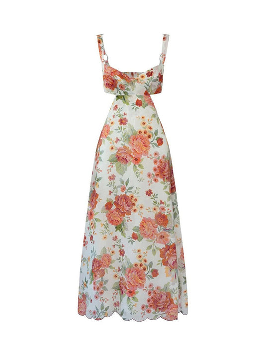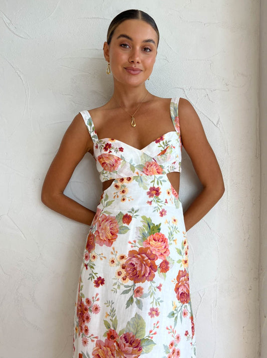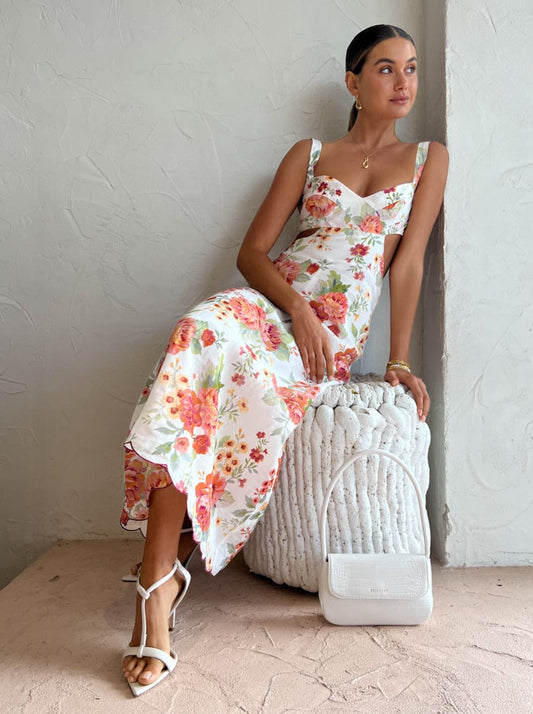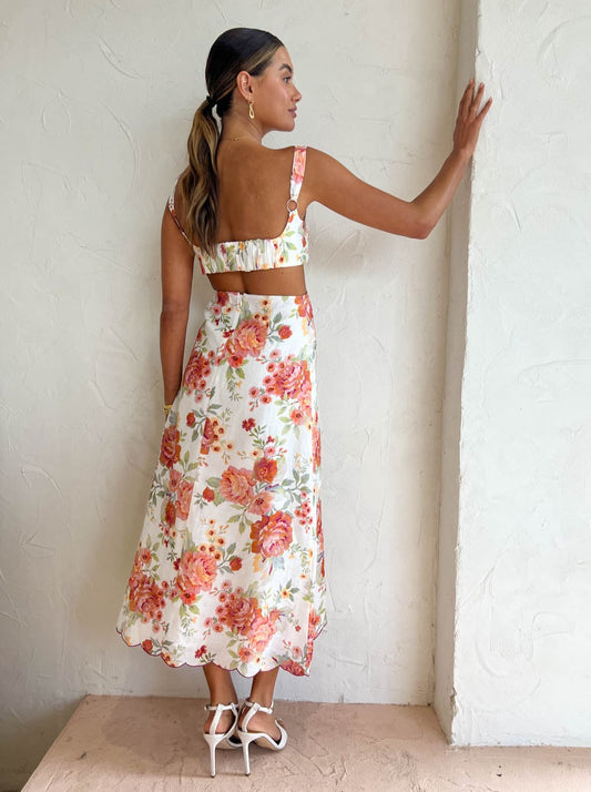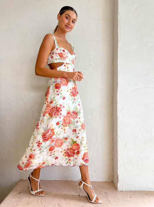 SOFIA perfectly balances feminine prints and soft silhouettes with the Delilah Cut Out Midi Dress in Sunset Floral.