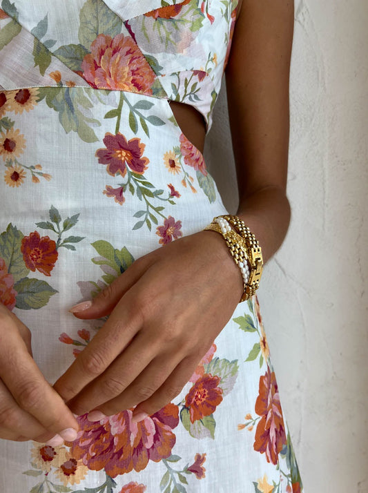 Complete the look with the Alias Mae Zi Heel in Cream, Arms of Eve Rae Chain Necklace in gold, Arms of Eve Farrah Link Earrings in Gold, Porter Pond Ring in Gold, Amber Seats Hunter Bracelet in gold, Porter Wave Ring Set in Gold,  and the Arms of Eve Helios Cuff Bracelet in Gold.