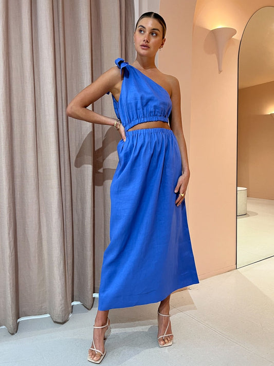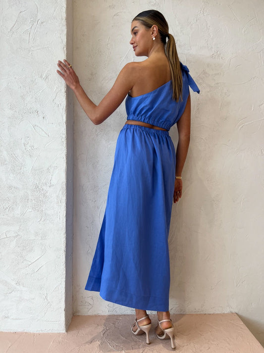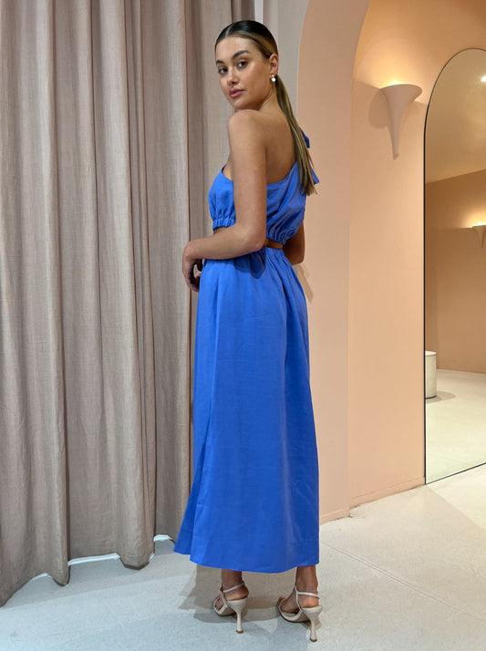 Crafted from a lightweight Ramie in Royal Blue. This delicate midi dress features a self-tie one shoulder and elasticated under-bust and waistline at the cut out waist.