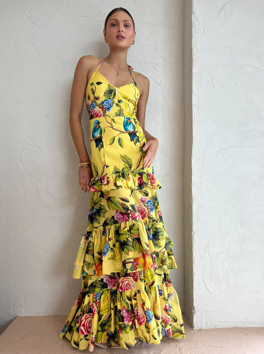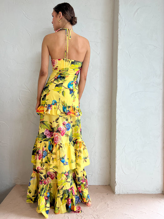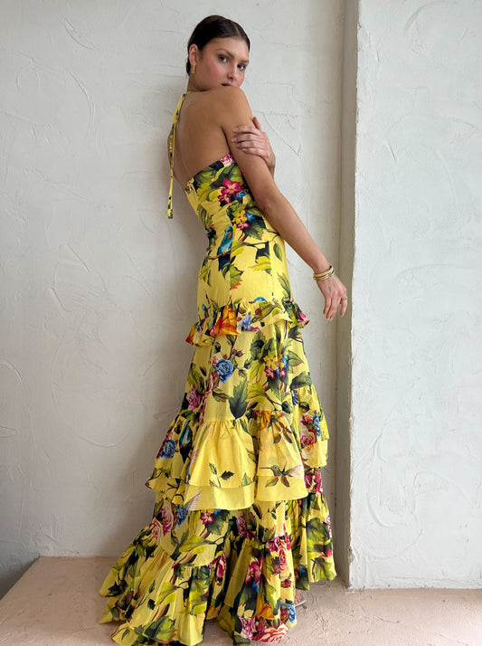 Introduce cascading ruffles and colourful hues into your occasion closet with the Florence Maxi Dress in Royal Botanica from Sonya.