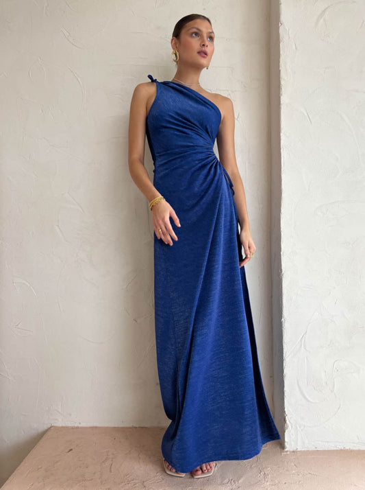 Cut from a silky to touch fabrication, this stand-out maxi dress features a one-shoulder neckline, a high split and signature cut-out detailing on the hip.
