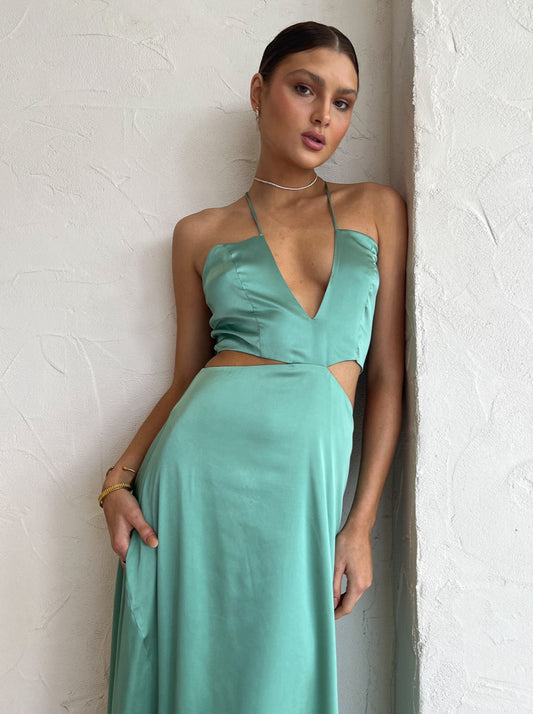 Crafted from a luxurious silky fabrication, this maxi dress features a deep plunging neckline and cut-out detail at the waist.