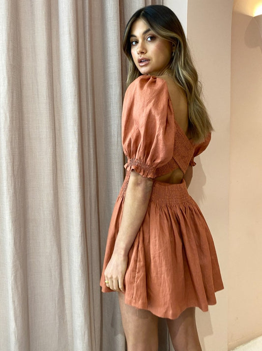 Enrich your mini dress repertoire with the earthy Clay hue of Sovere's Bounty Mini Dress.