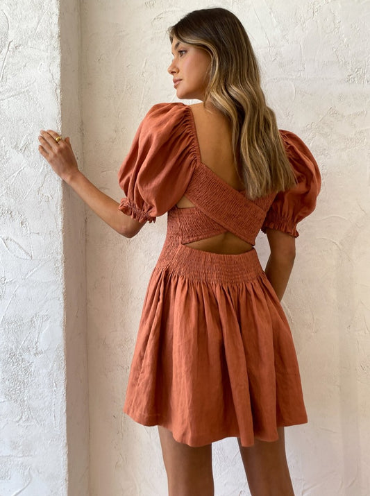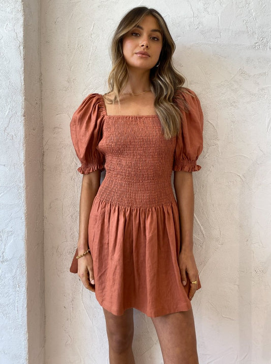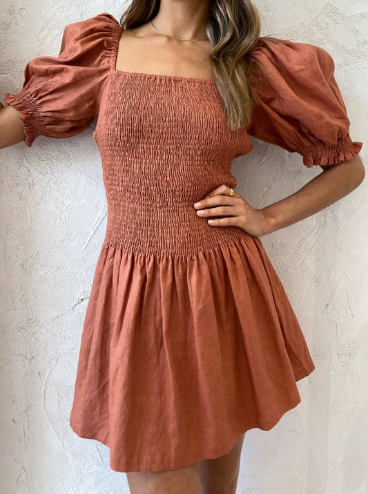 Crafted from a Flax Linen fabrication, this mini dress features a square neckline, elbow length puff sleeves and shirring throughout the bodice to form and accentuate.
