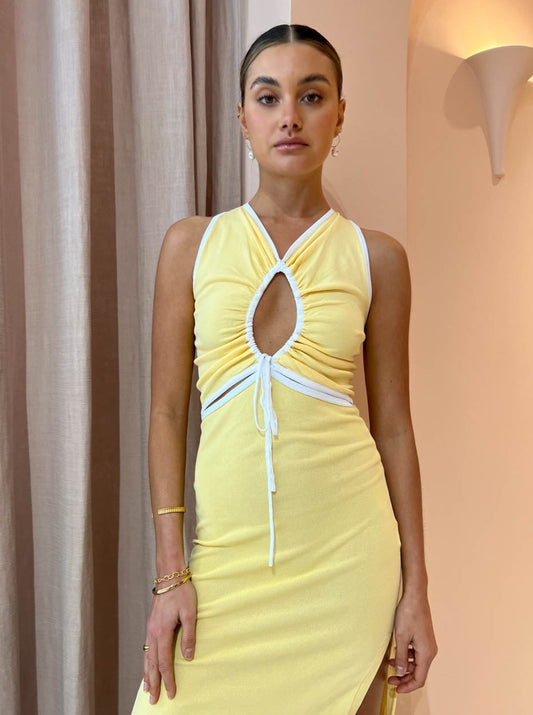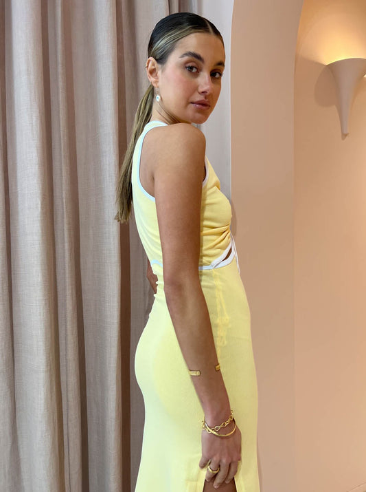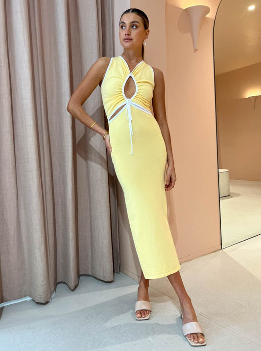 Feel feminine and flirty in Sovere Studio's Defy Knit Dress in Daffodil.