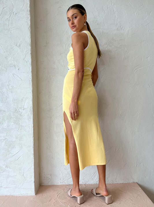 Designed to form and flatter, this sleeveless midi is crafted from a comfortable and soft rib knit fabrication. Sitting high at the neck, it features a drawstring keyhole detail at the centre front bodice, under-bust cutouts and is finished with two side hem splits.