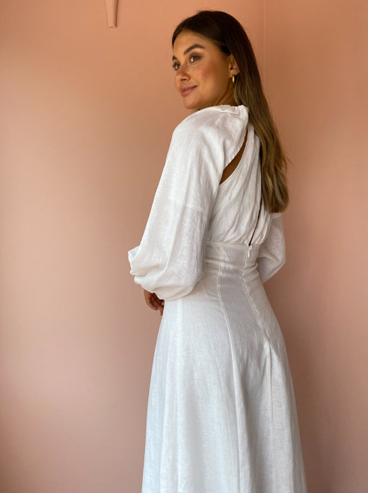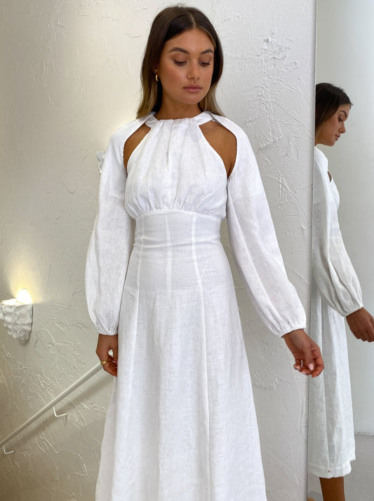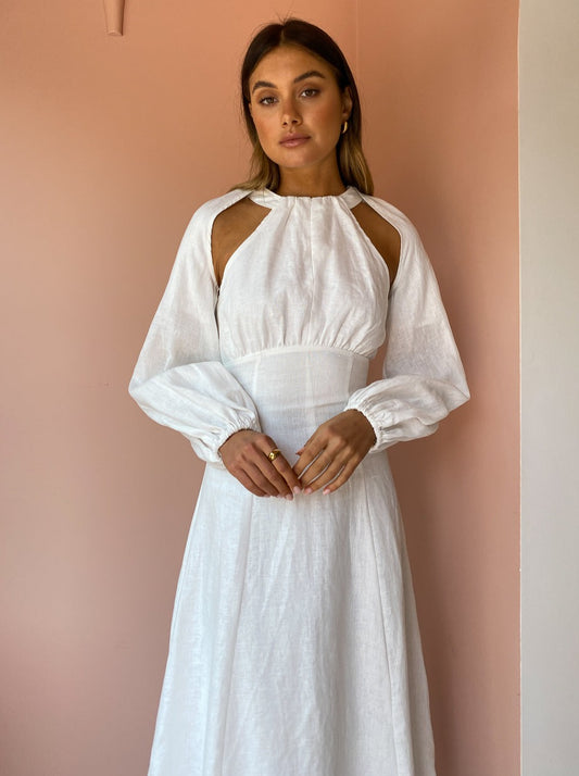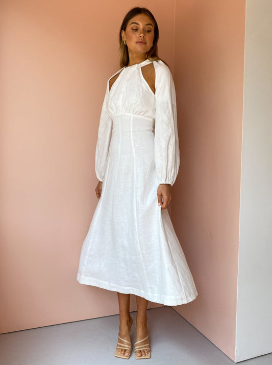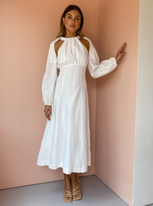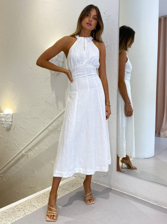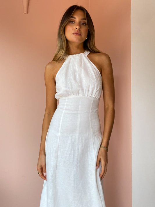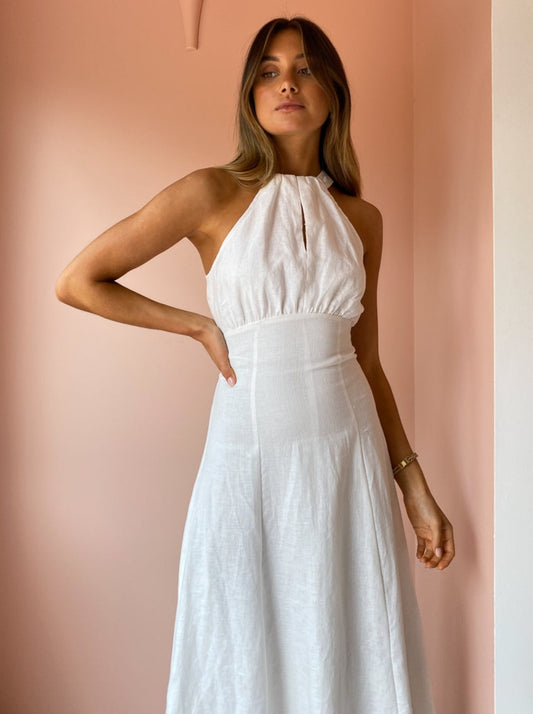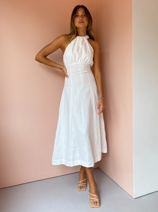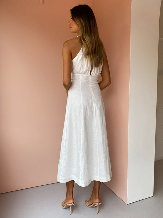This statement midi is crafted from a soft and breathable Linen in a classic Ivory hue. Cut with a contemporary halter neckline and gather detail across the bust, it tapers through the waist and falls into a flattering A-Line midi skirt.