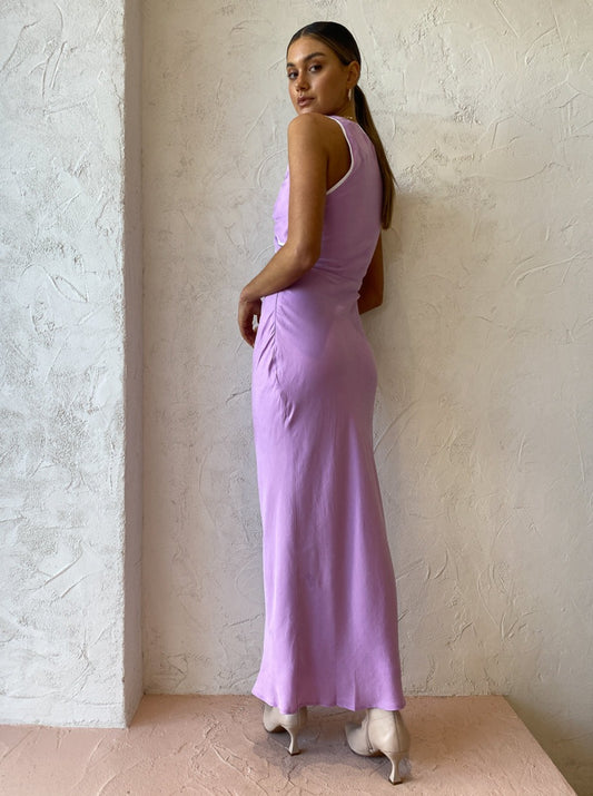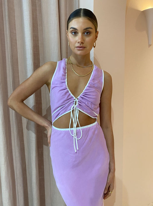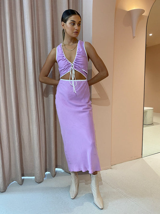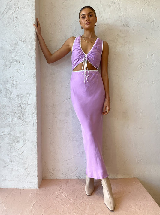 Designed to form and flatter, this sleeveless midi is crafted from a non-stretch twill Cupro blend in Lilac. Cut with a plunging adjustable V neckline with a keyhole feature, it's elevated with contrast trims and a signature front waist cut out detail.