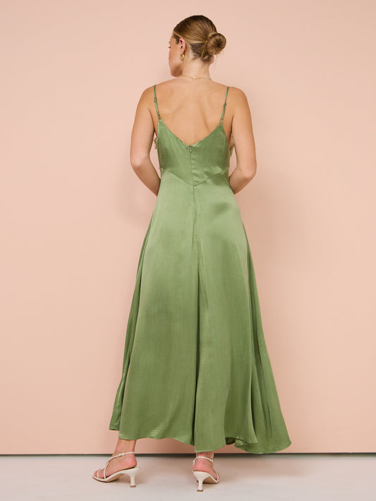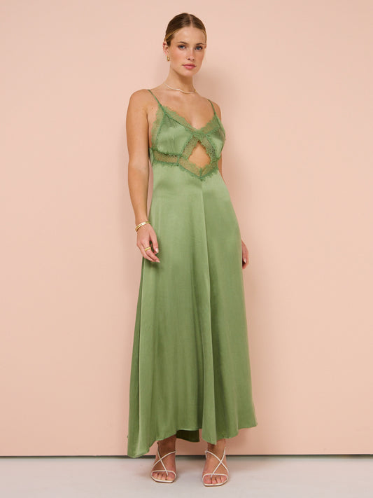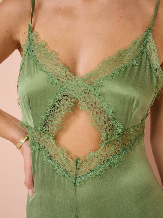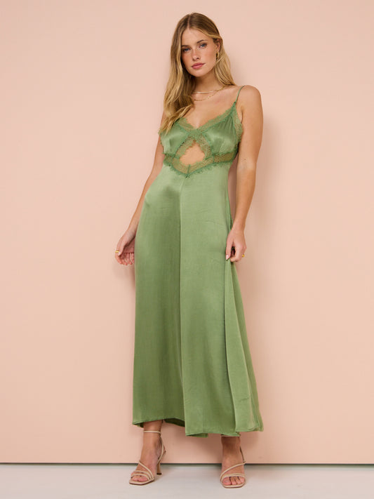 This sophisticated midi dress features cut-out details at the centre front, thin straps, and delicate lace which frames the bust.