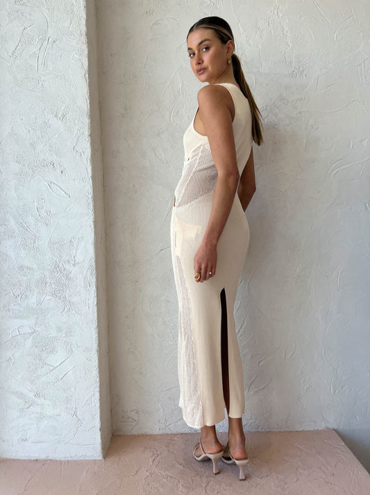 Delicate, this midi dress is crafted from a lightweight knit rib fabrication. Skimming and flattering with its body-con silhouette it features an interlocking bodice detail and contrast sheer knit panel that extends around the waist.