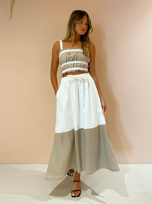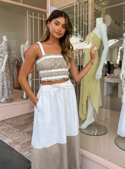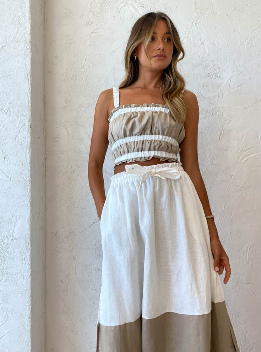 This charming mix-and-match crop is crafted from a Linen fabrication. Featuring contrast elasticated shoulder straps and triple contrast elasticated feature at the neckline and hemline to cinch and accentuate the femme form.