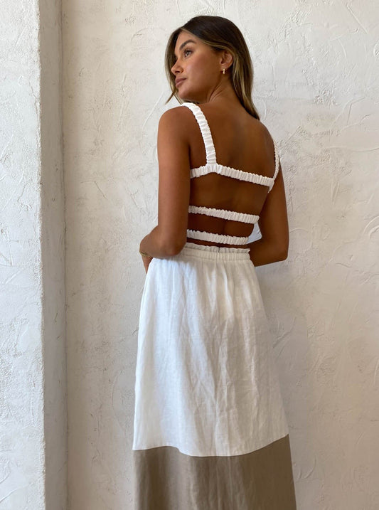 Turning heads with its exposed back with elasticated strap detailing, the Rally Crop perfectly pairs with the Rally skirt for long lunches and birthday celebrations or can be paired back with some denim or trousers for sunset cocktails.