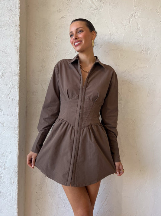 Take your look to the next level with our luxurious and exclusive Sovere Reminisce Corset Shirt Dress in Carob.
