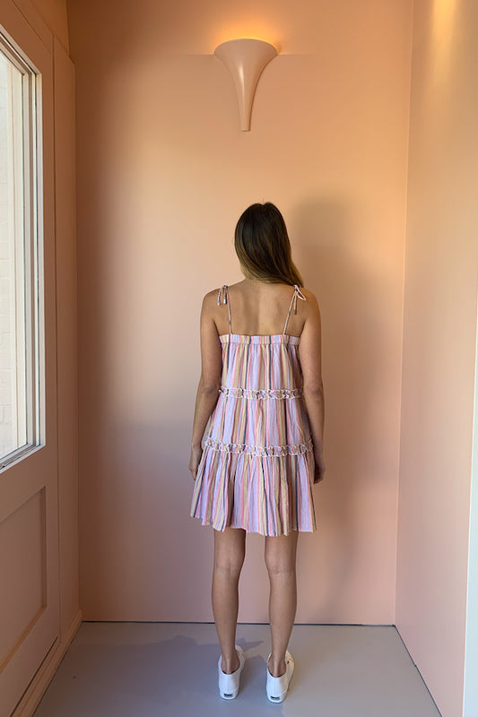 Crafted from 100% cotton with an all-over stripe print soft pastel sorbet tones, this mini features self tie shoulder straps, thick square neckline with a flattering tiered body.