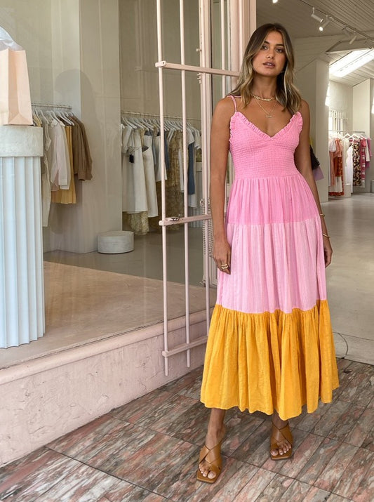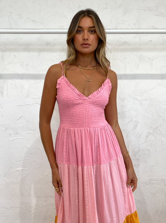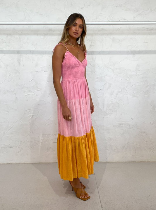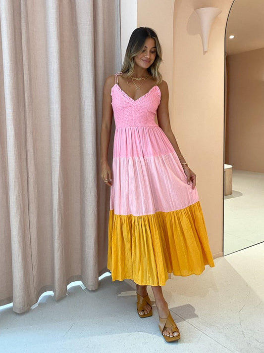 The Steele Leora Dress in Sundown is a tiered daytime midi, designed in a Coco girls dreamy summer colour palette.