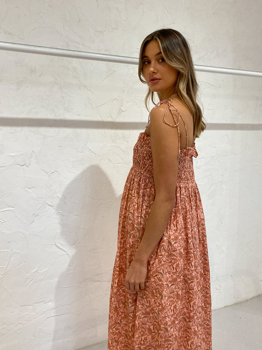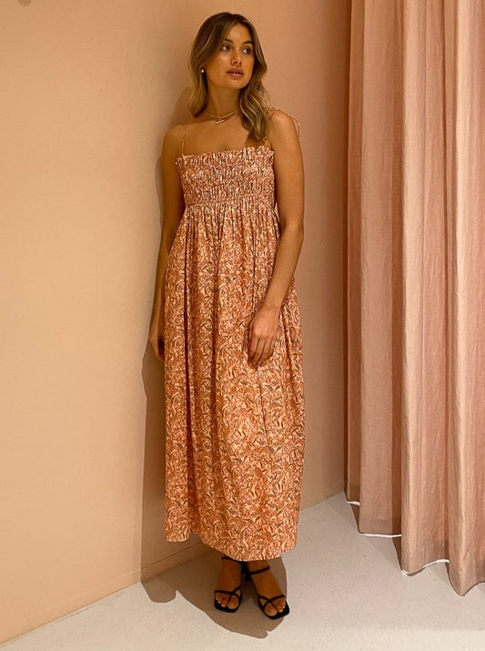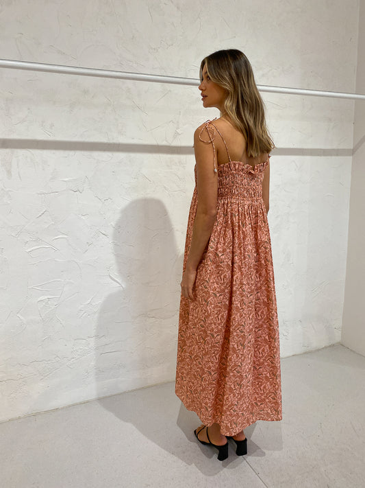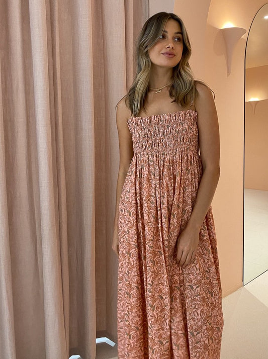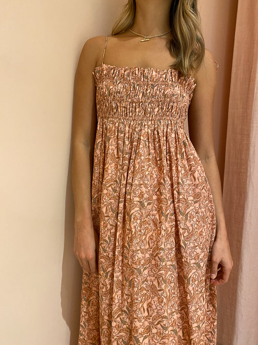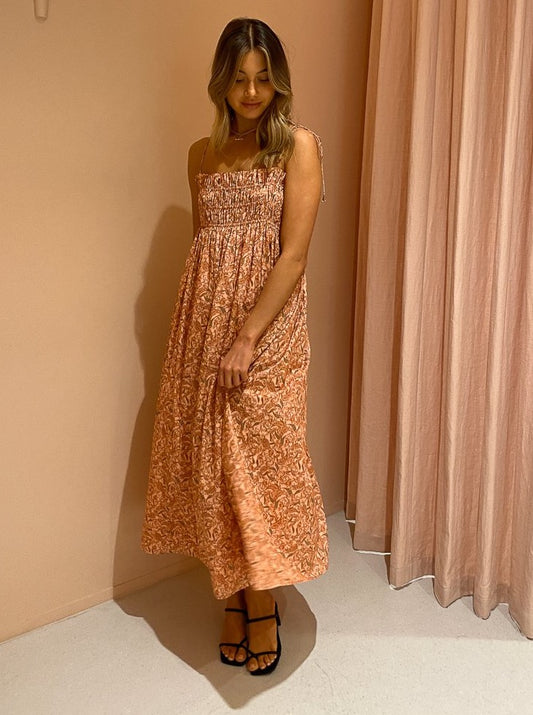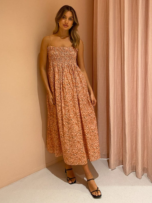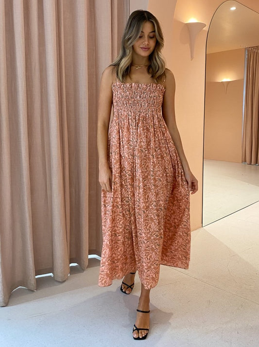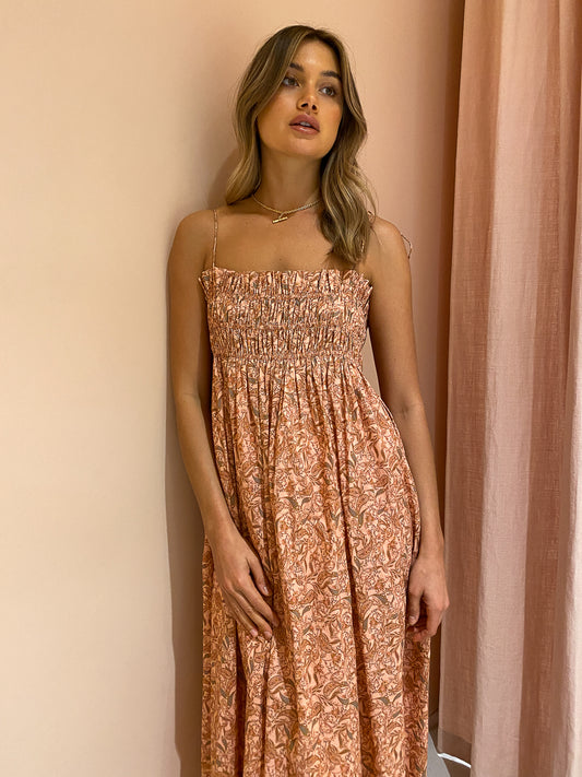 With the shirred bust and delicate shoe string straps, this midi dress will take you from desk to dinner and into the weekend.