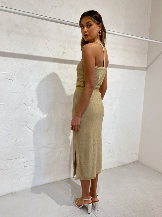 Delicately crafted from the brands signature viscose blend with metalic gold lurex, this timeless midi is designed to fit the femme form through the waist, finishing with a gentle fluted hem with a side split.