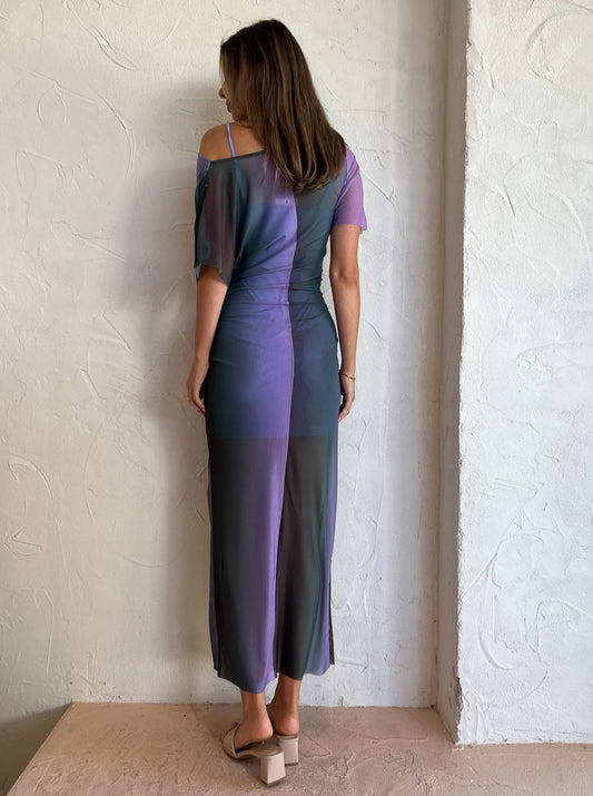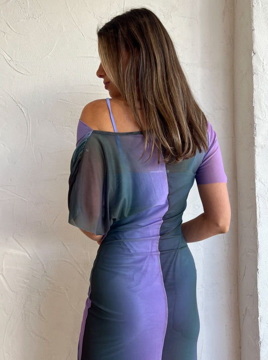 Crafted from a unique ombre mesh fabrication,  this versatile design hugs the silhouette that will heave heads turning. This can be styled in a draped cowl neckline, off the shoulder or without the slip for layering.