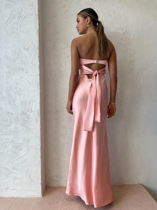 Embody elegance with the Satin Tie Back Strapless Maxi in Fairy Floss from Third Form.