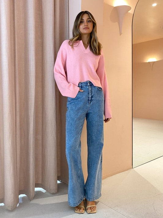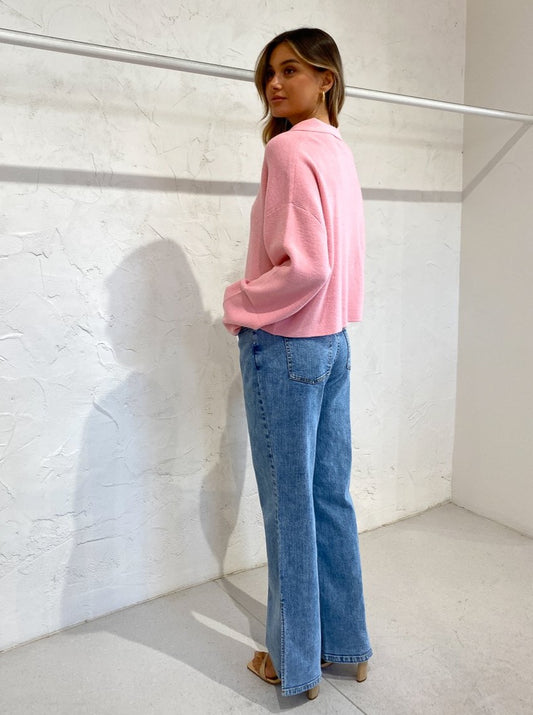 Coco Styling Tip: Complete the look with the Third Form Oversized Collared Knit in Baby Pink, the Alias Mae Cassie Heel in Natural and the Reliquia Baby Coralia Earrings in Gold