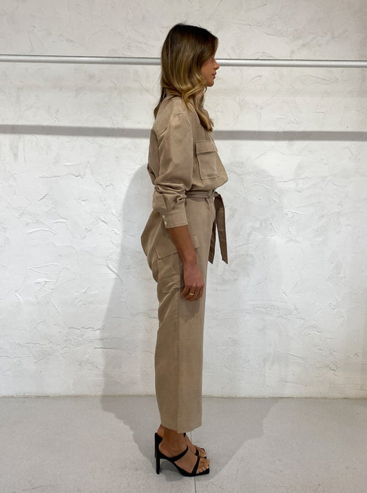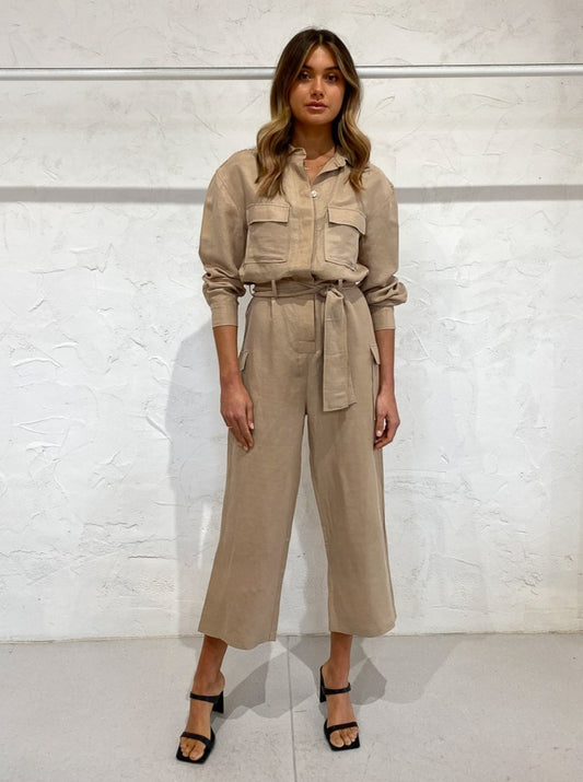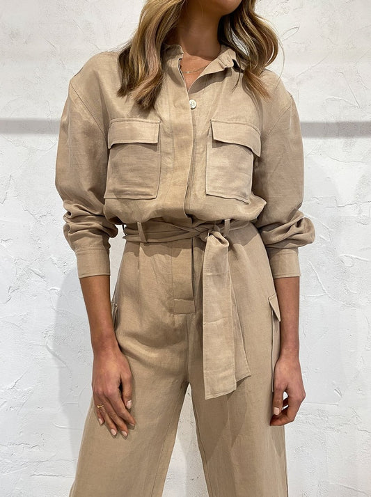 Crafted from a breathable premium curpo and linen blend with a slight sheen, this contemporary boiler suit references utilitarian design featuring a concealed placket, button through opening and belt loops with a self tie to accent the femme waist.